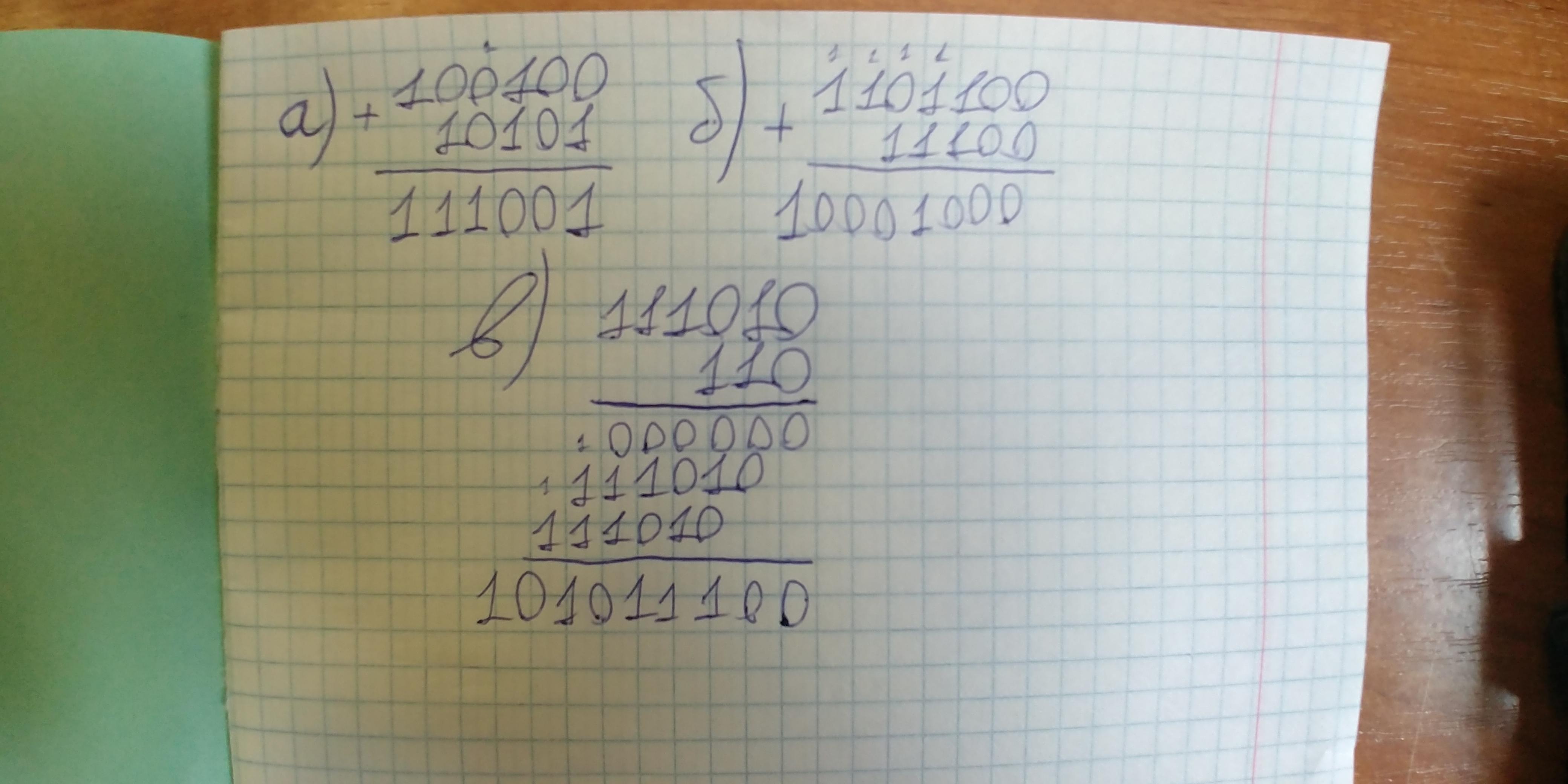 а) 100100+10101; б) 1101100+11100; в) 111010 •110