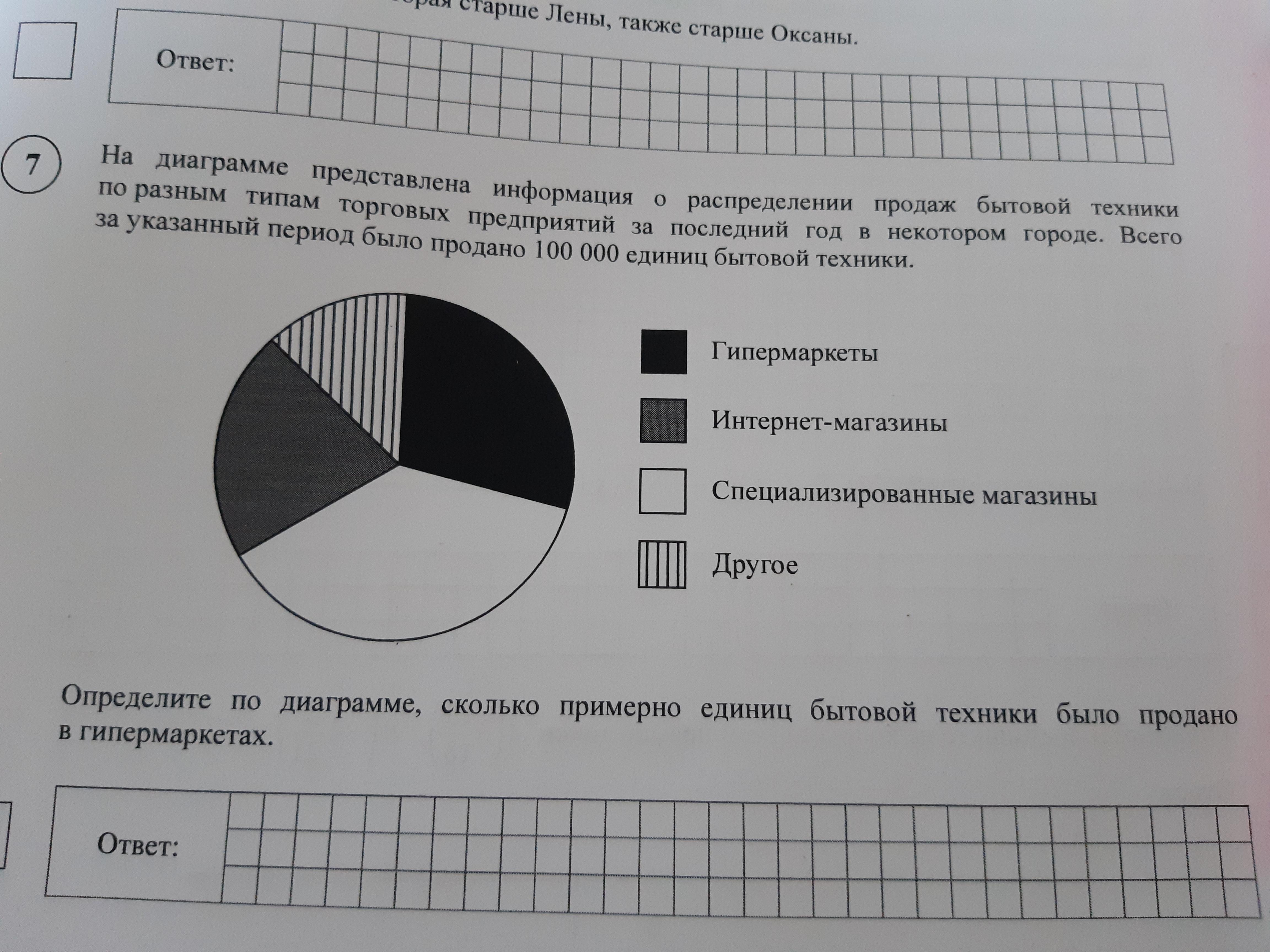По диаграмме видно, что проданная в гипермаркетах техника занимает чуть больше четверти, то есть около 30% (ВПР обычно не сильно придирается по этому поводу, так что достаточно указать примерное число.