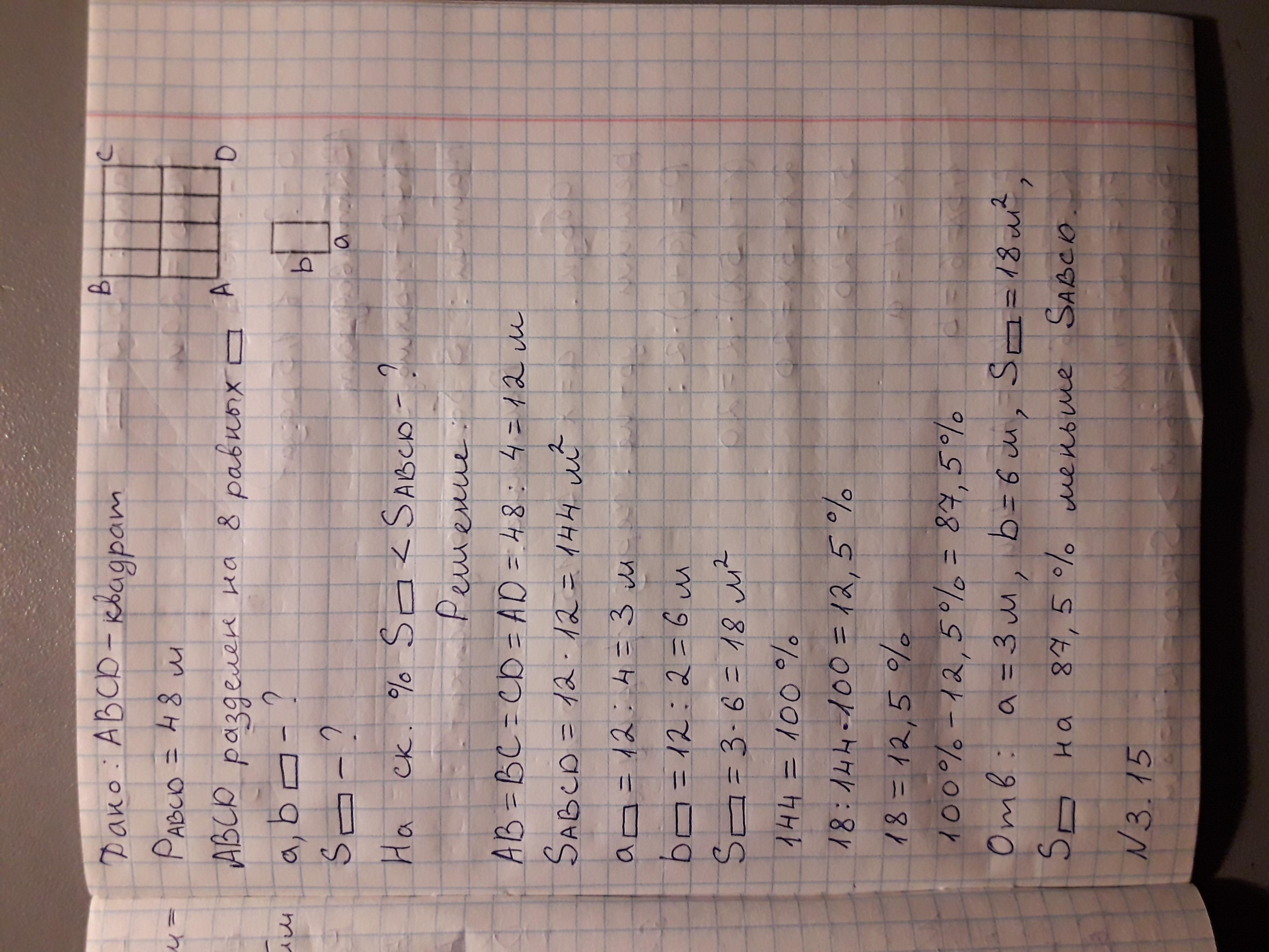 огород имеет квадратную форму с периметром 48 м. он разделен на 8 равных прямоугольных участков. найдите a) стороны, b) площадь прямоугольных участков. на сколько процентов площадь прямоугольных участков меньше площади огорода?