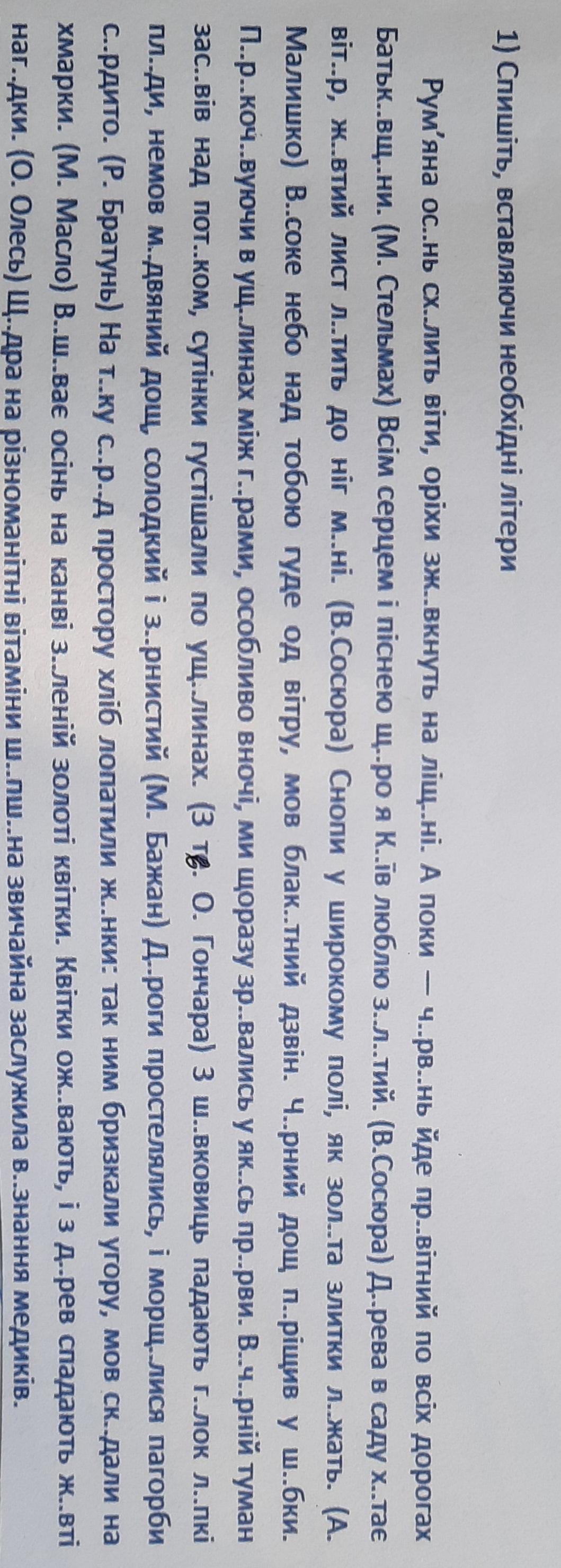 Ответ: Рум"яна осінь схилить віти,оріхи зжовкнуть на ліщині. А поки - червень йде привітний по всіх дорогах Батьківщини. Всім серцем і піснею щиро я Київ люблю золотий. Дерева в саду хитає вітер , жовтий лист летить до ніг мені . Снопи у широкому полі,як золота злиткі лежать. Високе небо над тобою гуде од вітру,мов блакитний дзвін. Чорний дощ періщив у шибки. Перекочовуючи в ущелинах між горами,особливо вночі,ми щоразу зірвались у якісь прірви. Вечірній туман засивів над потоком, сутінки густішали по ущелинах. З шовковиць падають гілок липкі плоди,немов медвяний дощ,солодкий і зернистий. Дороги простелялись, і морщилися пагорби сердито. На т?ку серед простору хліб лопатили жінки : так ним бризкали угору,мов скидали на хмарки. Вишиває осінь на канві зеленій золоті квітки. Квітки оживають , і з дерев спадають жовті нагидки . Щедра на різноманітні вітаміни шипшина звичайно заслужила визнання медиків.