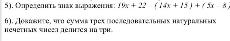 5) Сначала раскроем скобки и получим: 19 х+22-14х-15+5х-8 сократим: 10х=-1, х=-0,1, значит знак выражении отрицательный.