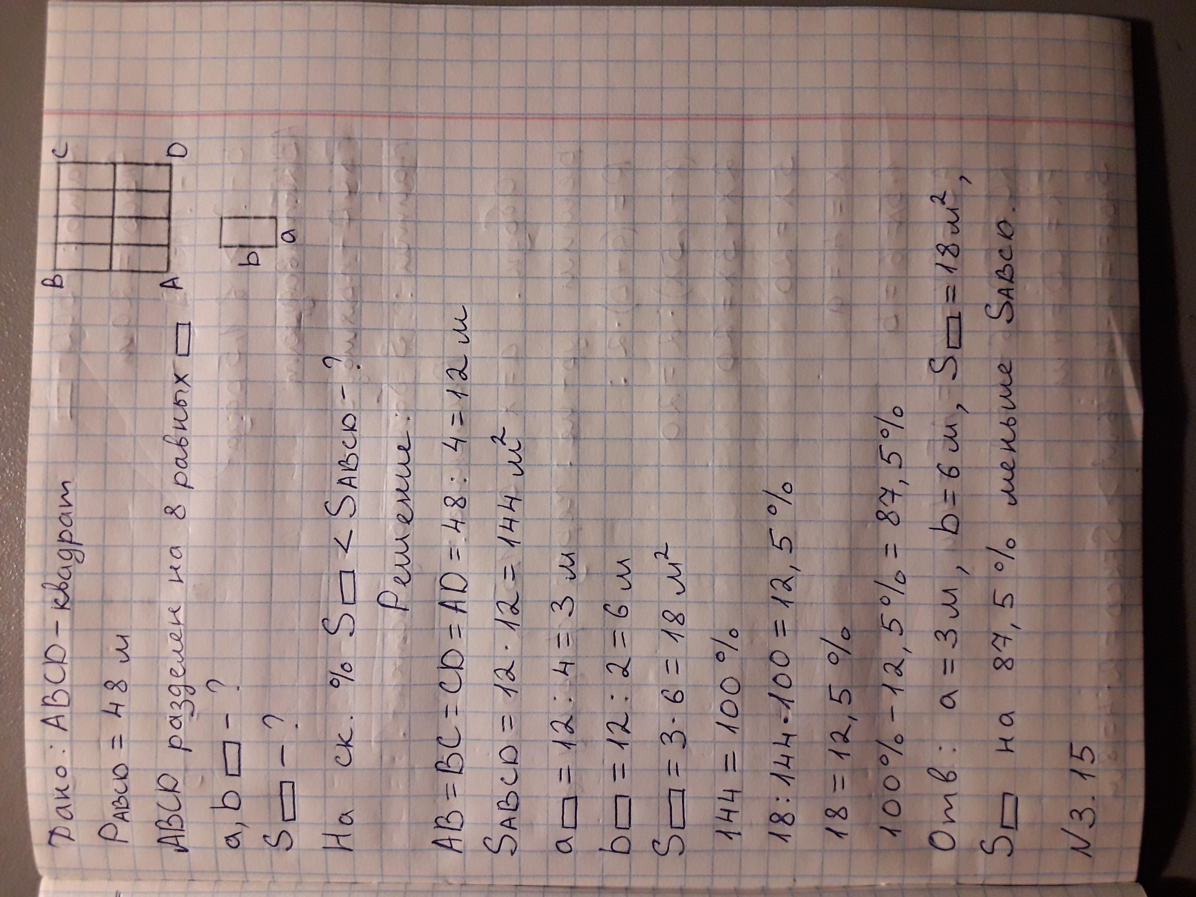 Ответ:3м; 6м; 18м^2; на 87,5% меньше