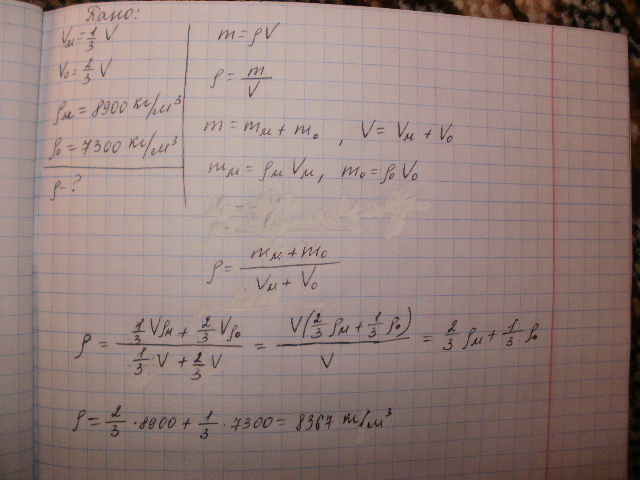 Фигурка собачки отлита из смеси меди и олова.Какова средняя плотность смеси, если в ней 1/3 меди ( объёму) и 2/3 олова?