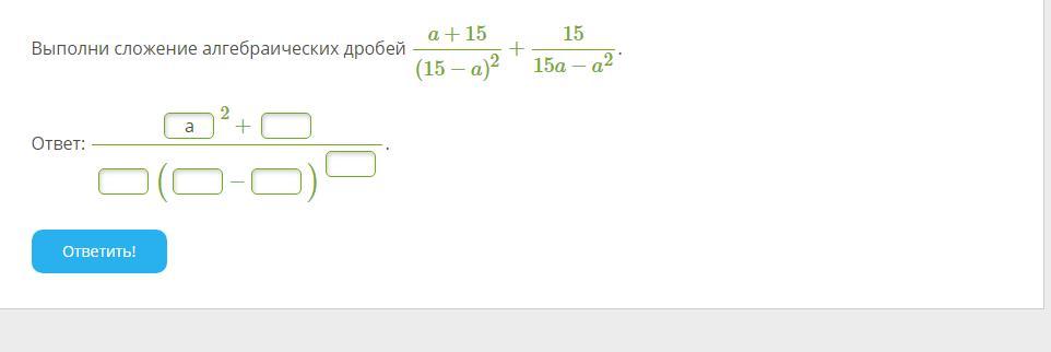 Душевный крик Выполни сложение алгебраических дробей a+15/(15−a)^2 + 15/15a−a^2 /дробь ^возведение в степень (квадрат в данном случае) 8 класс