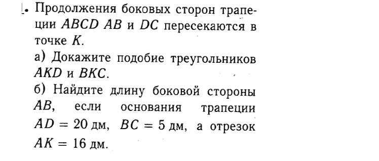 образовались два подобных треугольника AKD и BKC основания которых 20дм и 5дм