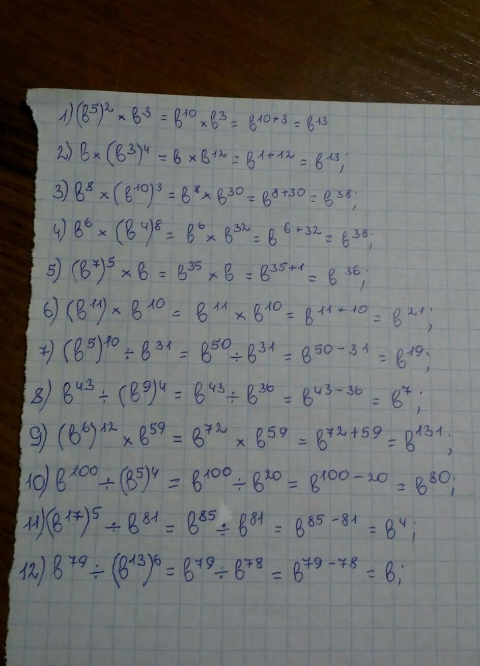 ПОМОГИТЕ ПЖ 1) (b⁵)²×b³ 2) b×(b³)⁴ 3) b⁸×(b¹⁰)³ 4) b⁶×(b⁴)⁸ 5) (b⁷)⁵×b 6) (b¹¹)×b¹⁰ 7) (b⁵)¹⁰: b³¹ 8) b⁴³: (b⁹)⁴ 9) (b⁶)¹²×b⁵⁹ 10) b¹⁰⁰: (b⁵)⁴ 11) (b¹⁷)⁵: b⁸¹ 12) b⁷⁹: (b¹³)⁶ понимаю, баллов мало но это последние