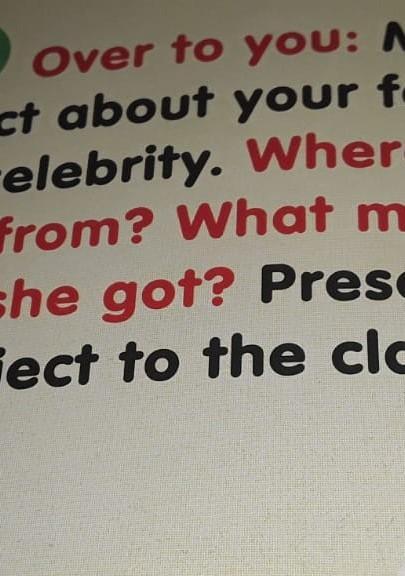 33 @U Over to you: Make a project about your favourite sports celebrity. Where is he/she from? What medals has he/she got? Present your project to the class.Можно даю 60 балоов если правильно и быстрее ооаоарвр так писать нельзяну как-то писать Нормально а то бан Можно по быстрееее☝️❤