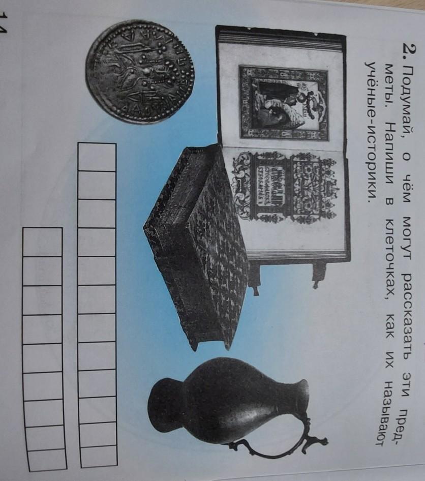 подумай, о чем могут рассказать эти предметы. напиши в клеточках, как их называют ученые- историки