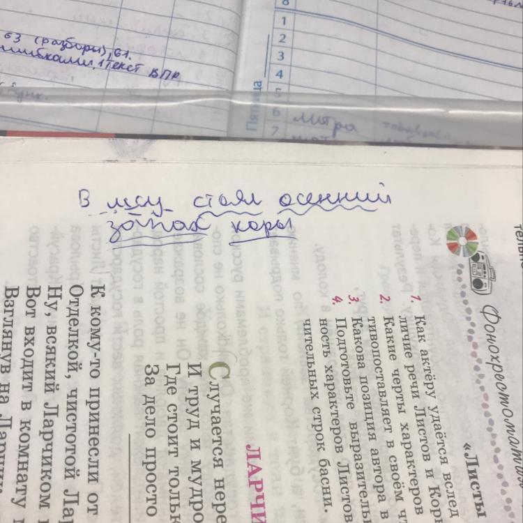 В(предлог) лесу (существительное) стоял (глагол) запах (существительное) коры (существительное) и (союз) сухих (прилагательное) листьев (существительное).