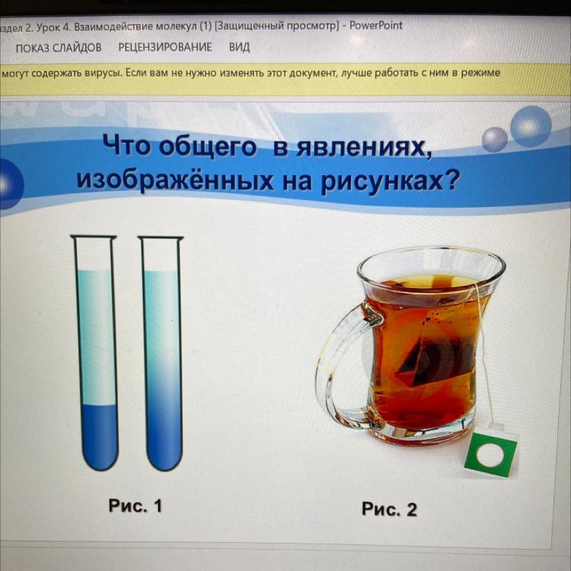Я так понял, что в первой колбе 2 вещества, которые со временем смешиваются, это можно понять по второй колбе. Это явления называется диффузия