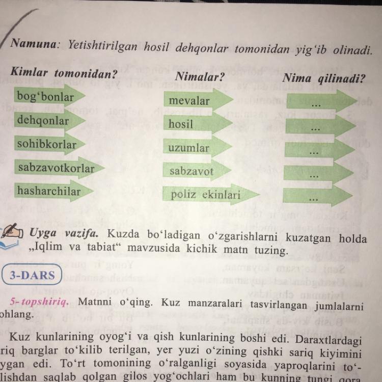 Birinchi ustundagi sozlarni ikkinchi ustundagi sozlar boglang va berilgan savollarga mos gaplar tuzib javon Bering