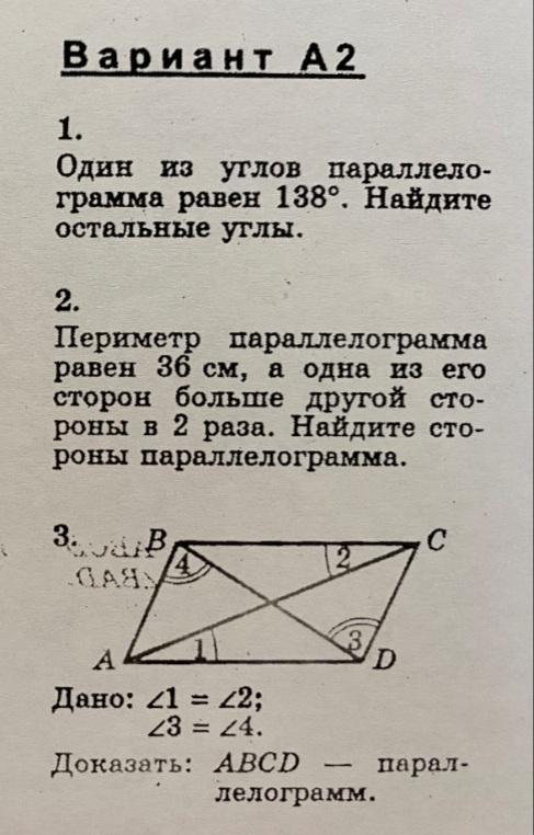 Так как у параллелограмма противоположные углы равны а сумма углов 360 то получаем один угол 138 и два оставшихся (360-138-138)/2=42