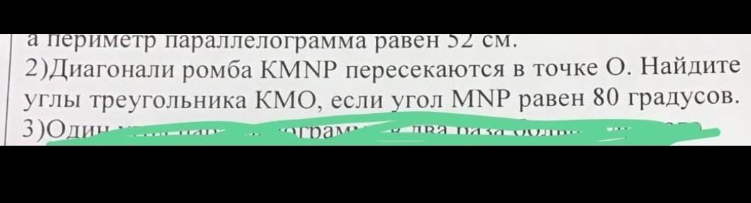 Противоположные углы в ромбе равны,значит угол МКР=80. Диагонали ромба делят углы пополам , значит уголМКО=40. Диагонали ромба вз. перпедикулярны , значит угол КМО=90-40=50