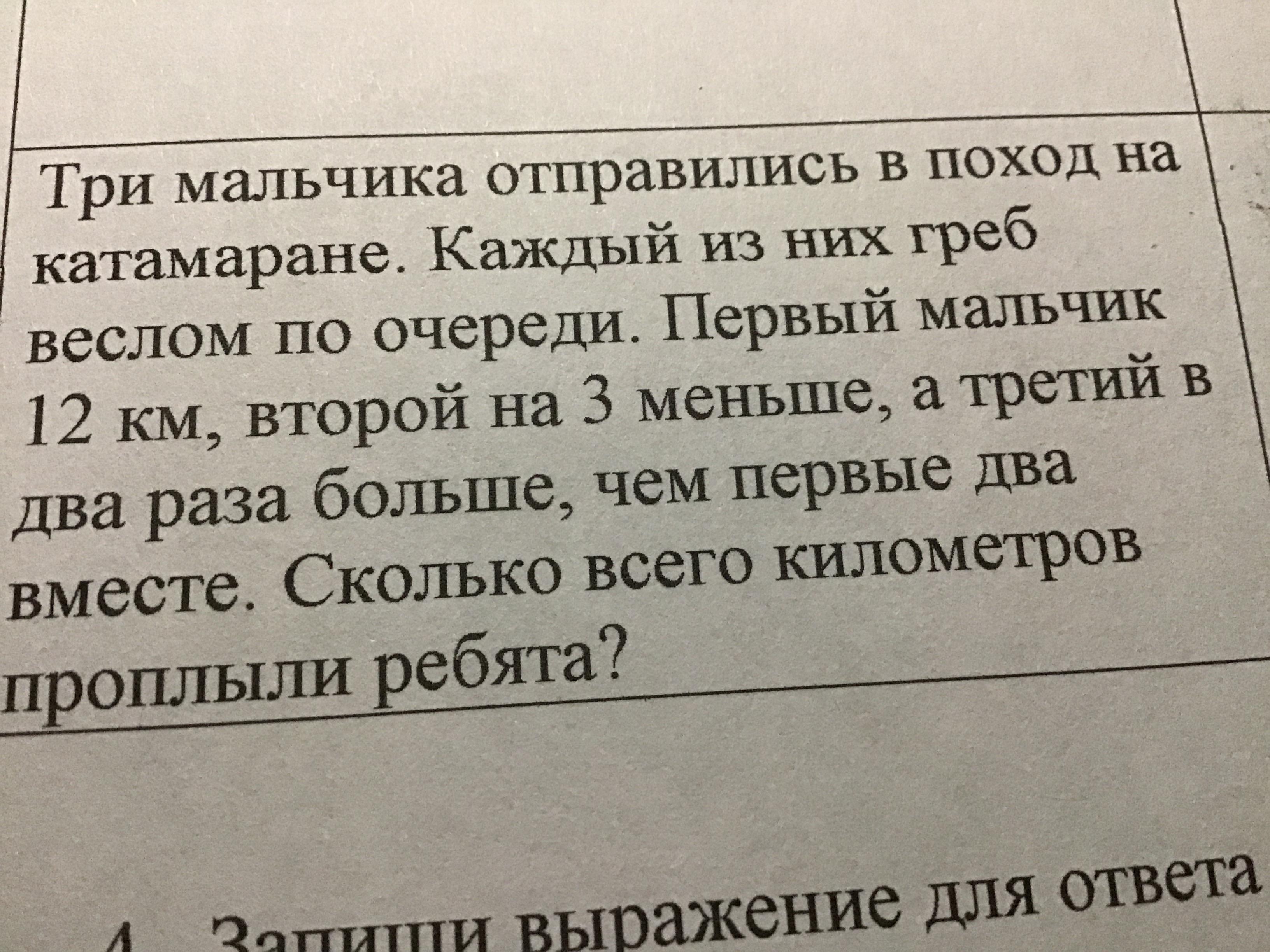 12 + 9 + 42 = 63 км - проплыли вместе три мальчика