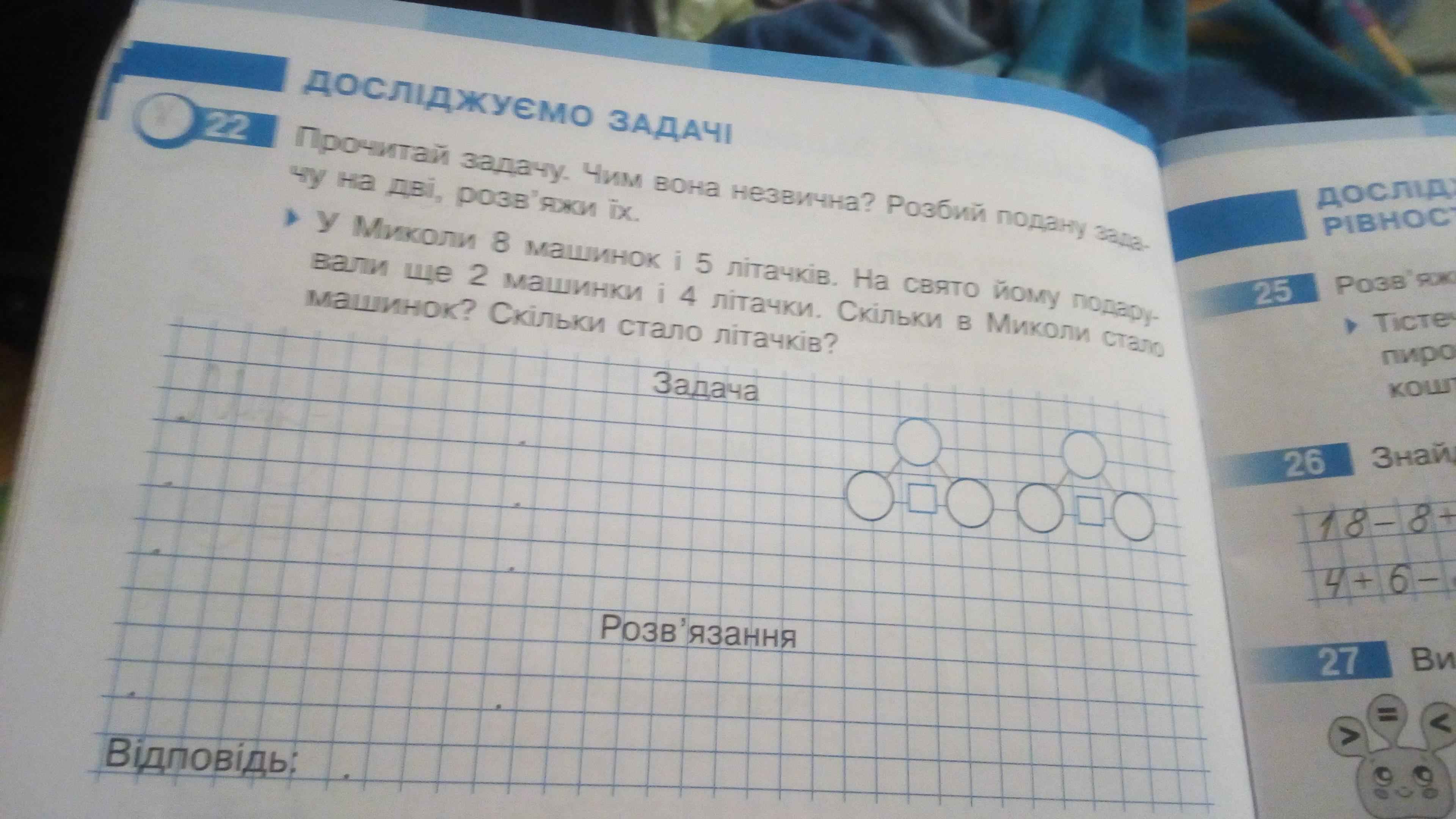 миколи 8 машинок і 5 літачків.на свято йому подарували ще 2 машинки і 4 літачки.скількив миколи стало машинок? скільки стало літачків? умова задачі рішення