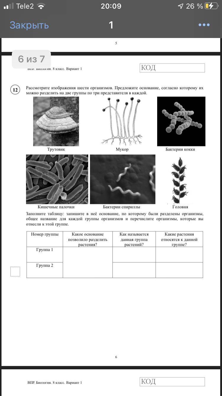 Основание для разделения растений по группам: строение их организма ( прокариоты - группа 2 и эукариоты - группа 1)