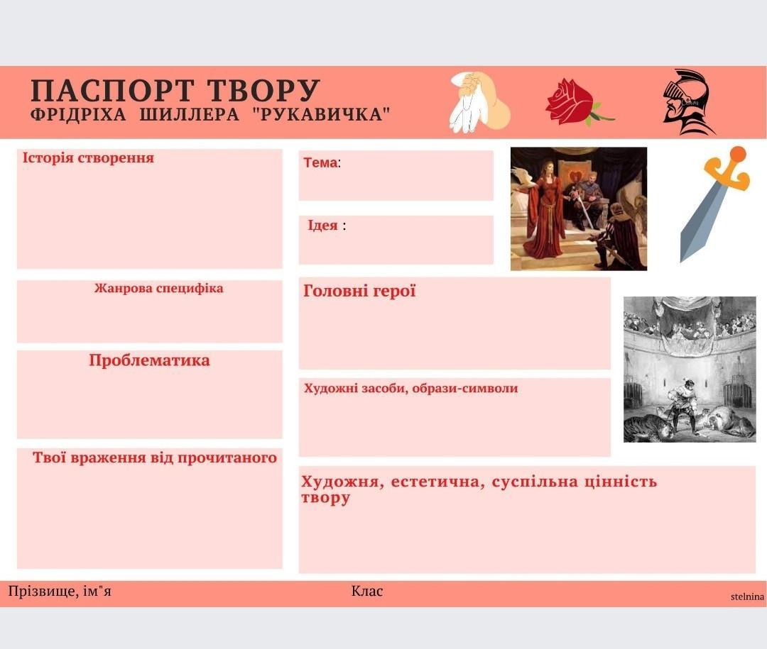 Історія створення балади “Рукавичка” Сюжет балади «Рукавичка» запозичений із французької хроніки XVI ст.: придворна дама піддала закоханого в неї кавалера жорстокому випробуванню. Він гідно витримав його, довівши на очах королівського двору і своє кохання, і свою мужність. Але після цього рицар залишив даму свого серця. У Шиллера сюжет драматичніший. У творі є опис місця дії, оточення короля, поведінки хижаків; протиставлення хвилинної примхи Кунігунди смертельній небезпеці для Делоржа.