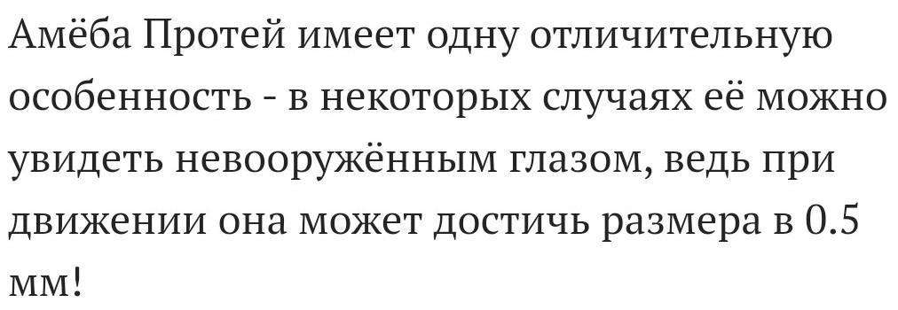 Амеба протей не имеет постоянной формы тела. Поэтому она и получила название «амёба», что в переводе с греческого языка означает «изменчивая». Также под микроскопом, можно заметить, что она медленно переползает на затемненную часть стекла. Яркий солнечный свет быстро убивает обыкновенных амёба