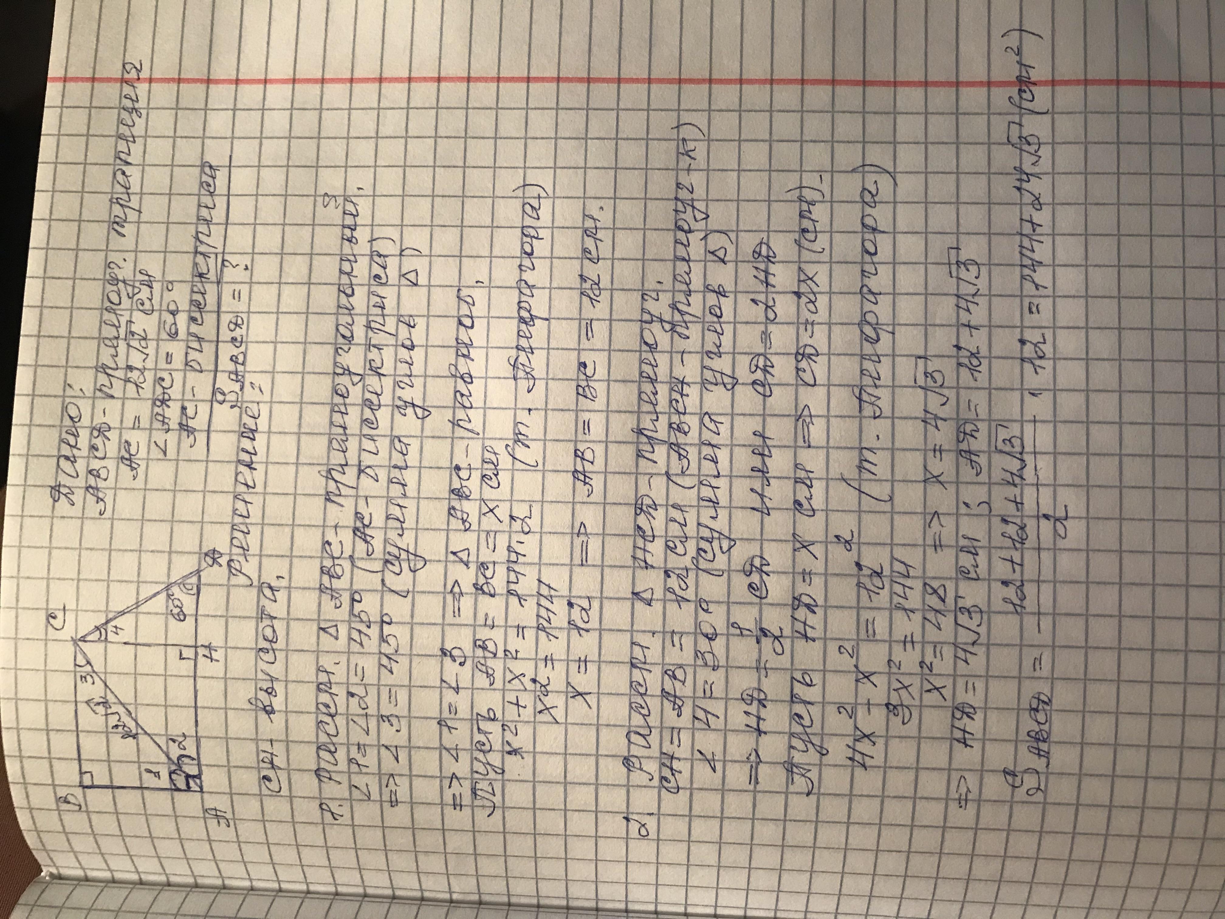 В прямоугольной трапеции ABCD AB перпендикулярна основаниям, диагональ AC=12√2см является биссектрисой угла <А Найдите площадь трапеции, если