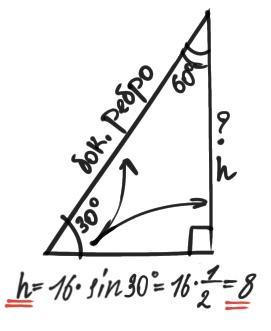 1) вычислите высоту произвольной пирамиды если ее боковое ребро, равное 16 см, наклонено под углом 30° к плоскости основания.