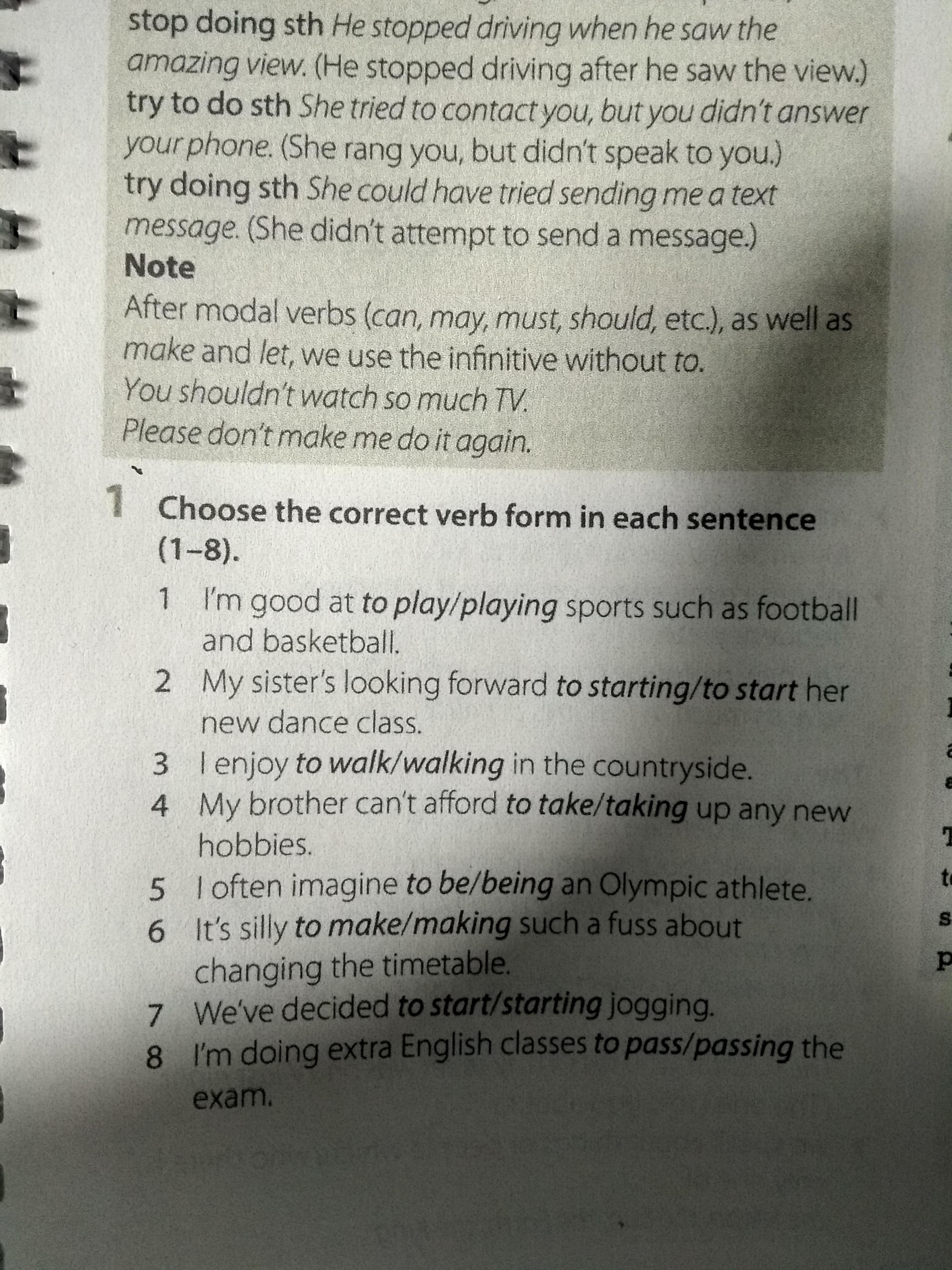 ex. 1: 1- playing, 2- to start, 3- walking, 4-taking, 5- being, 6- to make, 7- to start, 8- to pass .
