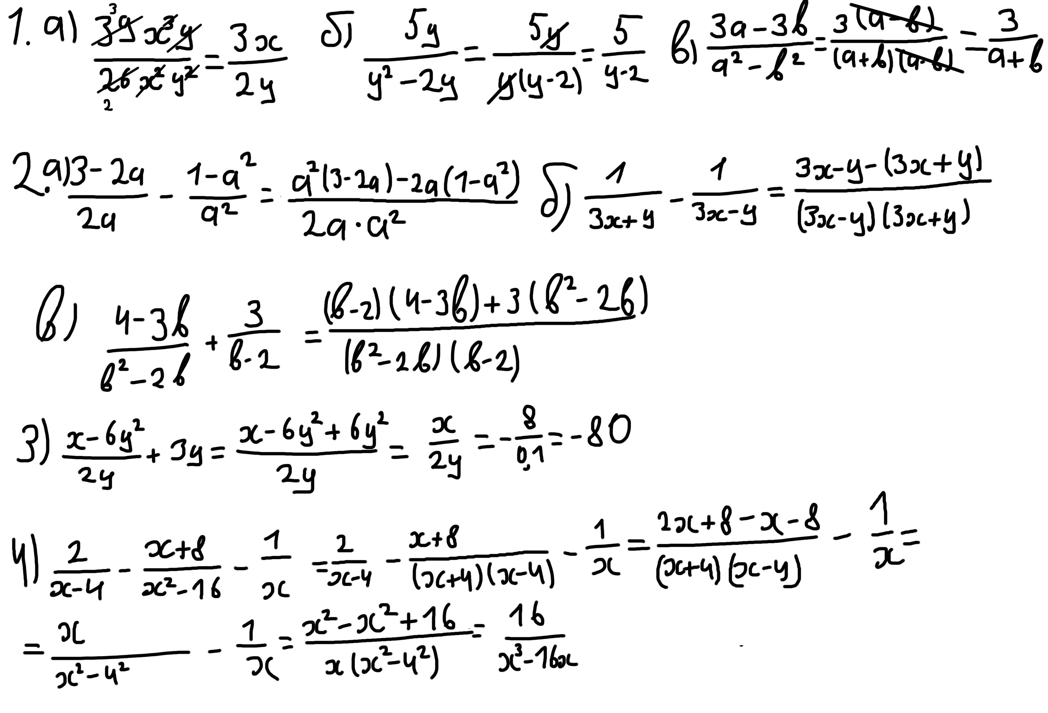 3. Сначала я решаю сократить это выражения. Находим общий знаменатель для двух слагаемых дробей и записываем под одной чертой. У нас появляются подобные члены -6y2 и +6y2 они исключают друг друга, их сумма равна нулю. Далее сократить невозможно, поэтому я подставляю данные в условии значения и считаю.