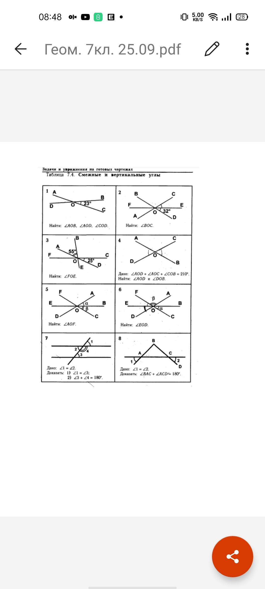 Вертикальные углы вместе доют 360 градусов, и например угл левый и правый--равны, также и с верхним и нижним. Т.е запиши угл AOD=BOC, угл AOB=DOC. BOC =23 градусам=AOD=BB