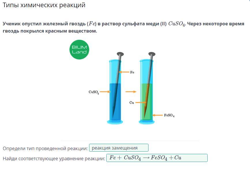 Ученик опустил железный гвоздь (Fe) в раствор сульфата меди (II) CuSO4. Через некоторое время гвоздь покрылся красным веществом.