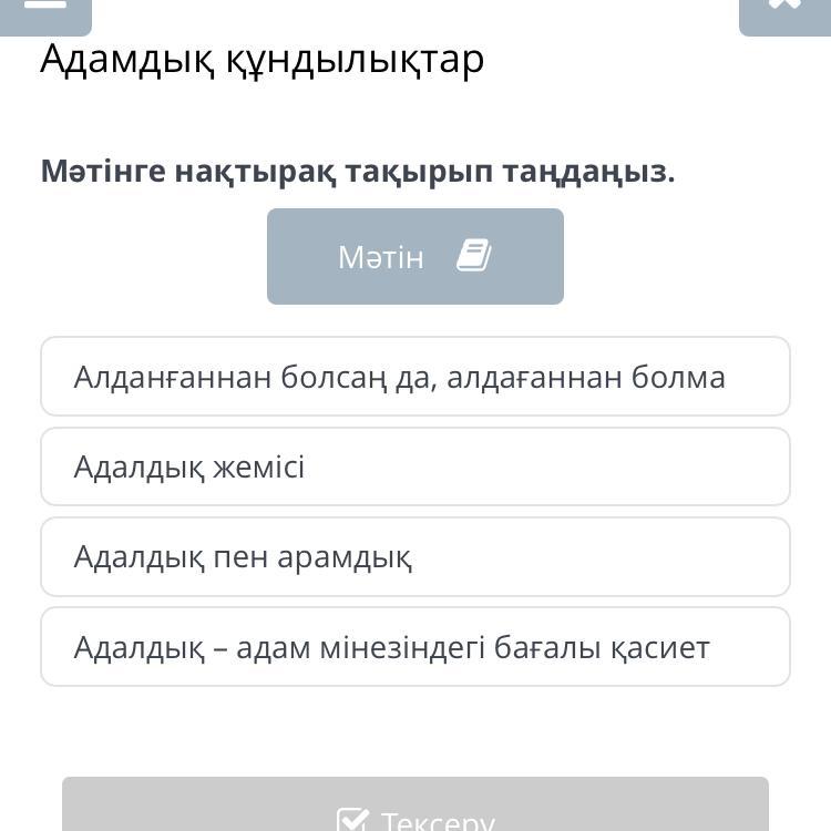 ІІ. Баяғыда бір патша өмір сүріпті. Патша адамдық құндылықтардың барлығына бірдей мəн беріпті де, адалдыққа айрықша қарайды екен. Ұзақ жылдар бойы елін адалдықпен, əділдікпен басқарыпты. Өкініштісі, ол əбден қартайған екен. Патшаның ұлдан тұяғы болмапты.