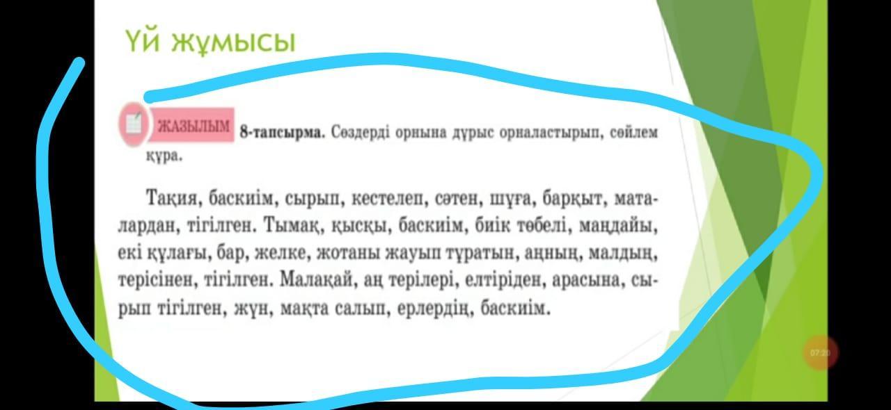 жаттығуды жазбаша орындайсыздар. Тапсырмада сөздердің орнын ауыстырып, сөйлем құрайсыздар.