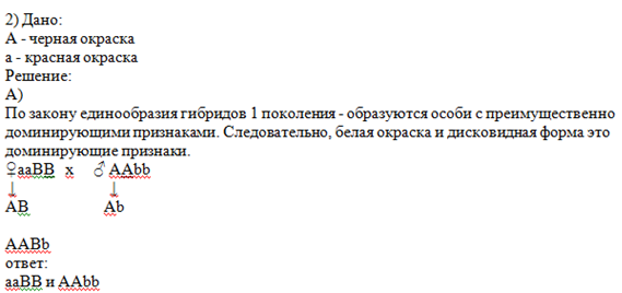 2. Тыкву, имеющую жёлтые плоды дисковидной формы, скрестили с тыквой, у которой были белые шаровидные плоды. Все гибриды от этого скрещивания имели белую окраску и дисковидную форму плодов. Какие признаки доминируют? Каковы генотипы родителей и потомства?