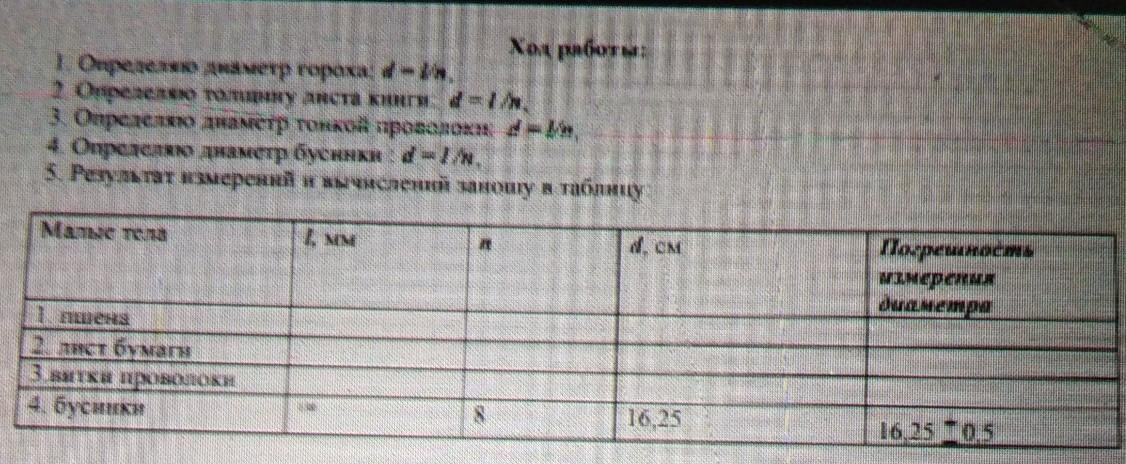 чтобы измерять величину L (длина ряда) вы должны создать ряд из какого-то количества N (тел, витков) в ряду, ну например возьмите 10 горошин, 20 листов книги, 15 витков проволоки (её надо намотать на что-то круглое, допустим карандаш), 8 бусинок.
