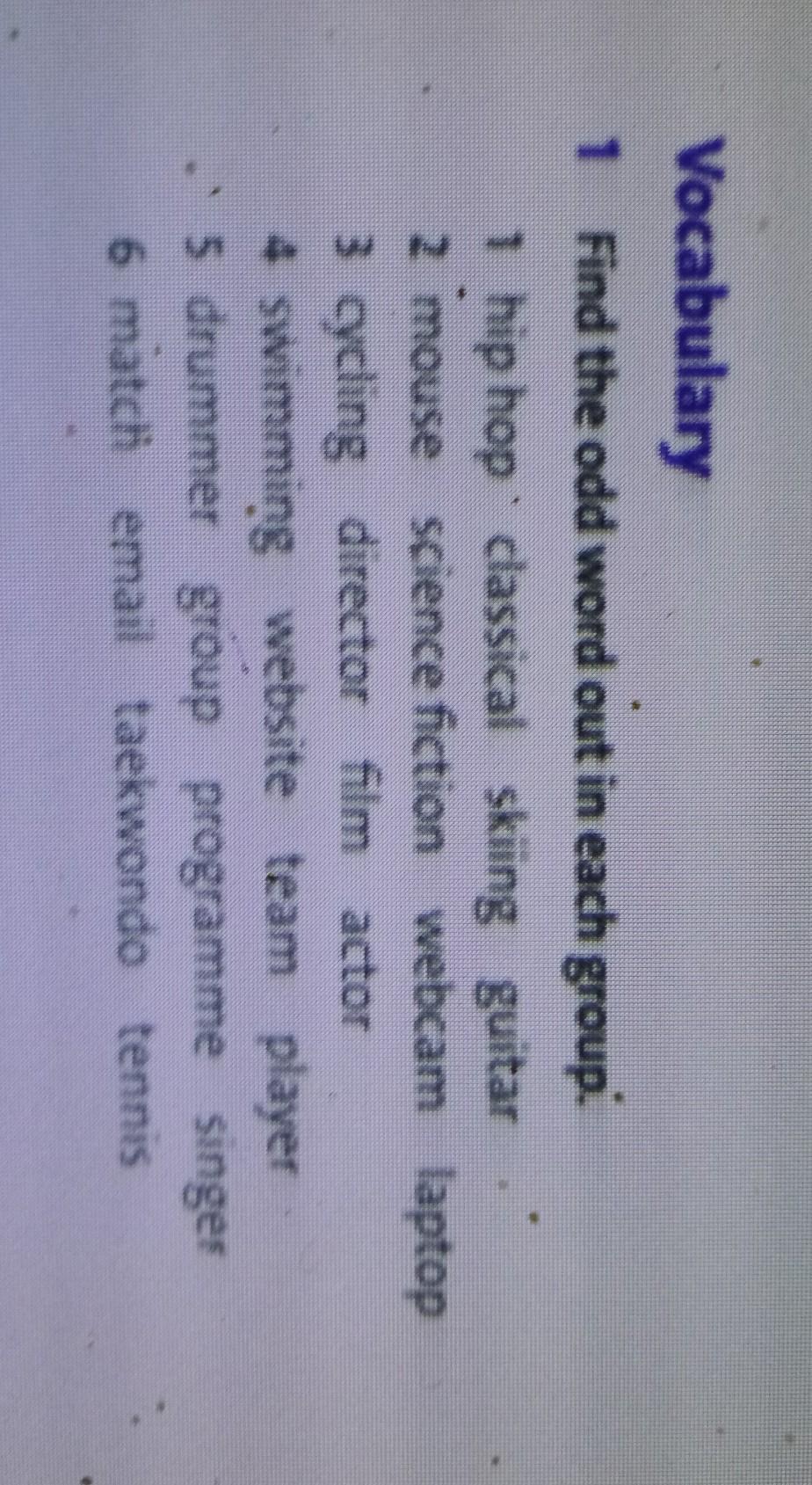 1)skiing2) science fiction 3) cycling 4) swimming 5) group 6) email