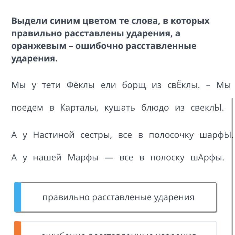 Выдели синим цветом те слова, в которых правильно расставлены ударения, а оранжевым – ошибочно расставленные ударения.