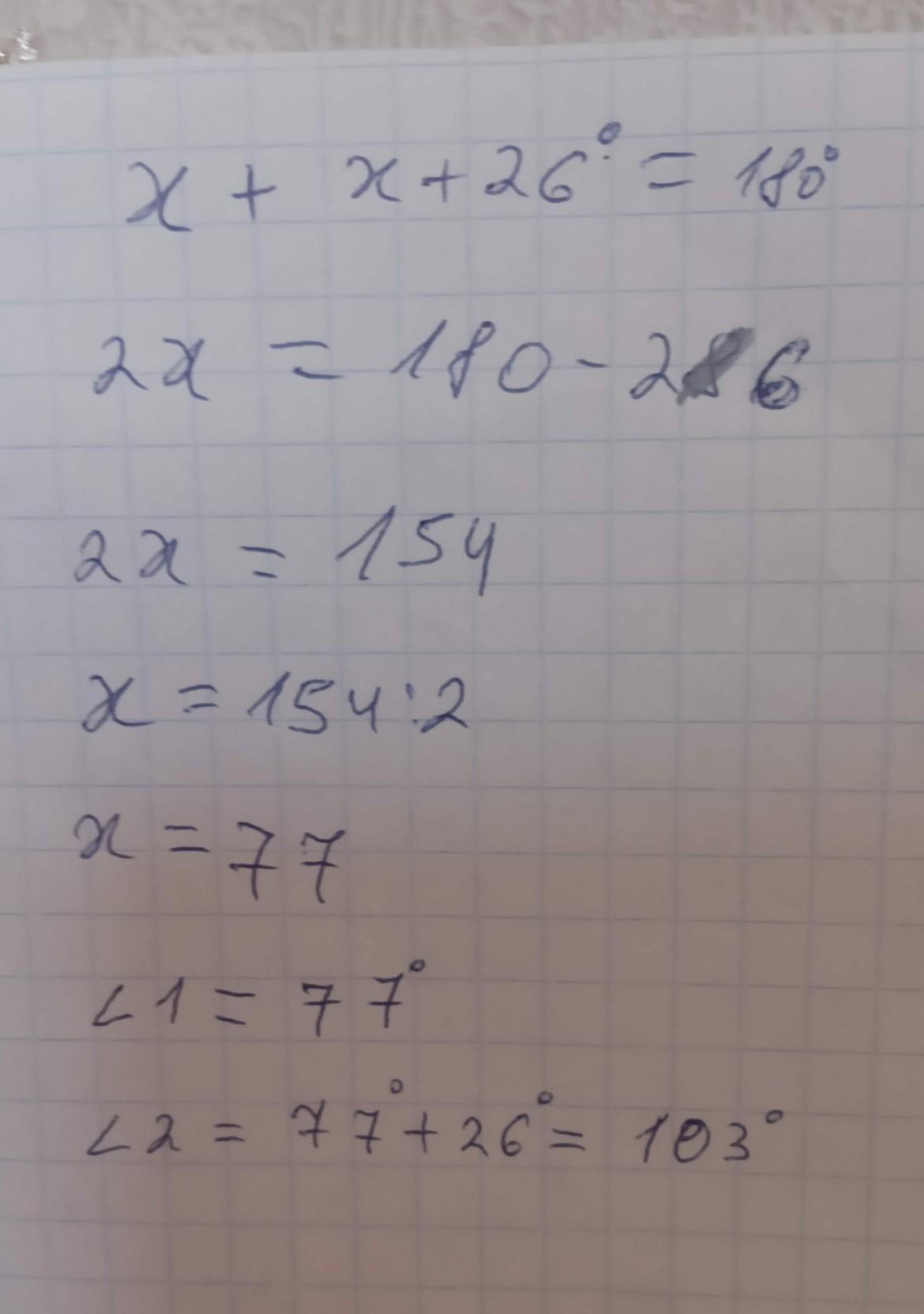 Нехай градусна міра більшого кута буде х, тоді меншого (х-26).