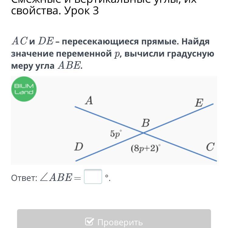 AC и DE – пересекающиеся прямые. Найдя значение переменной p, вычисли градусную меру угла ABE.