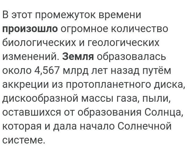 В этот промежуток времени произошло огромное количество биологических и геологических изменений. Земля образовалась около 4,567 млрд лет назад путём аккреции из протопланетного диска, дискообразной массы газа, пыли, оставшихся от образования Солнца, которая и дала начало Солнечной системе.