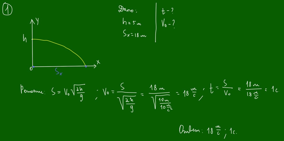 1. Тело брошено горизонтально с высоты 5 метров и дальность полета тела составила 18 метров. Найти время полета и скорость, с которой тело было брошено.