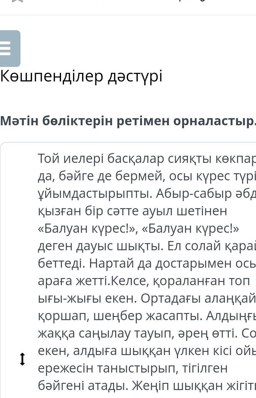 – О, ағайын! Бұл екі балуан да үлкен күш иелері. Біреуі ауылымыздың көптен бергі мақтанышы болса, екіншісі – жаңа көзге түсіп келе жатқан жас қайрат. Үлкен жығылса, сүйек жасиды, кіші жығылса, сағы сынады, сондықтан бүгін екеуі де жеңімпаз. Менің жасаған қазылығым – осы. Келісесіздер ме? Күрес те ата-бабамыздан келе жатқан салт-дәстүр ғой. Енді сол әдет-ғұрпымыз бойынша әдептен озбай, екеуін тең деп санайық, – деді қос балуанның да қолдарын тік көтеріп.
