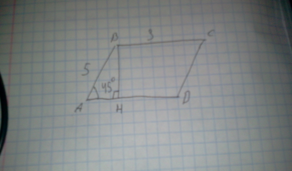 Площадь параллелограмма находится по следующей формуле: S=a*b*sinα. Здесь a=AB=5, b=AD=3, sinα=sin45, получаем S=5*3*√2/2=√2*7,5. Проверьте данные AB и AD, я мог ошибиться, т.к. плохое качество фотографии