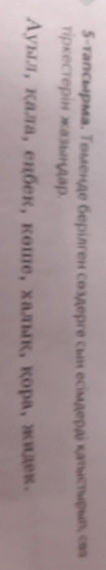 Ответ: керемет ауыл, шулы қала, тəтті еңбек, көшпелі халық, ескі көше, ежелгі қора, дəмді жидек