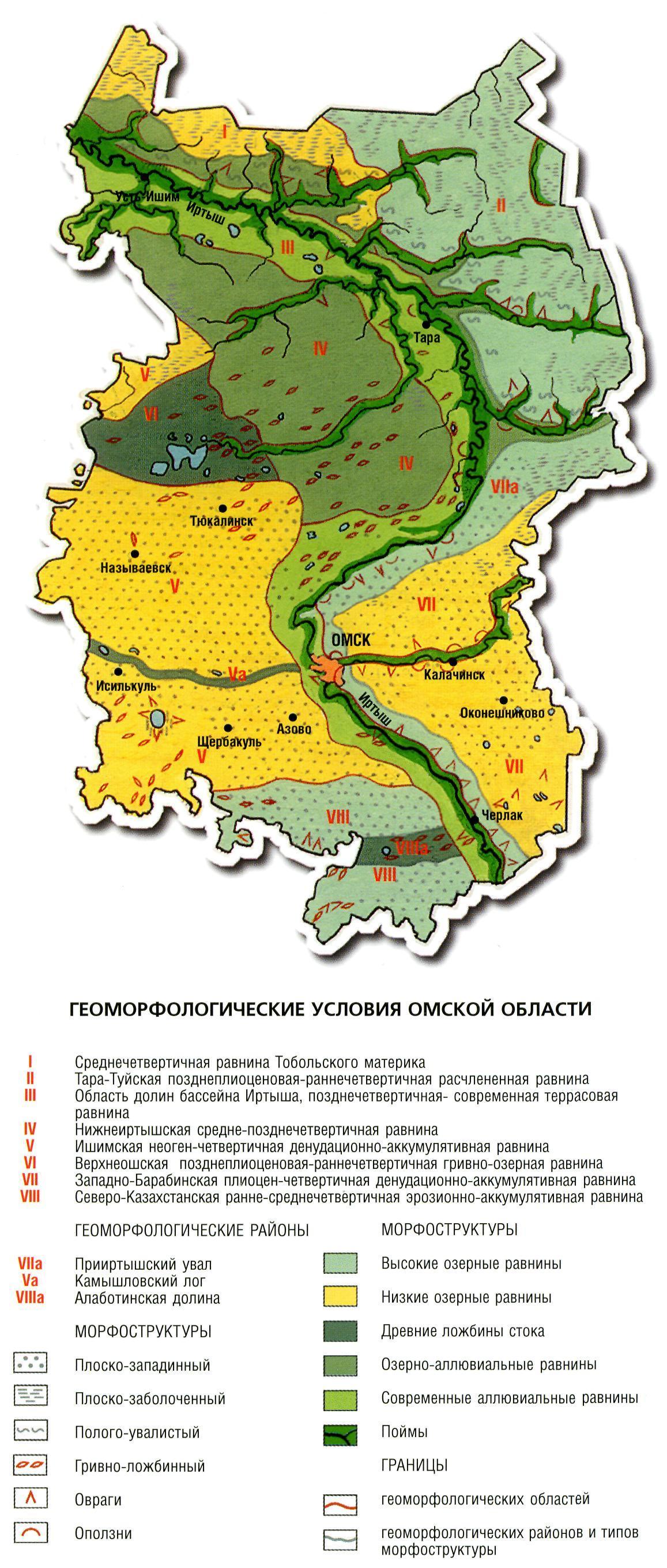 Омская область расположена на юге Западно-Сибирской равнины и как следствие имеет равнинную поверхность которую с юго-востока на северо-запад пересекает река Иртыш на побережье которой расположены поймы и аллювиальные долины.В южной части области преобладают низкие озёрные равнины, а в северной находятся заболоченные участки.