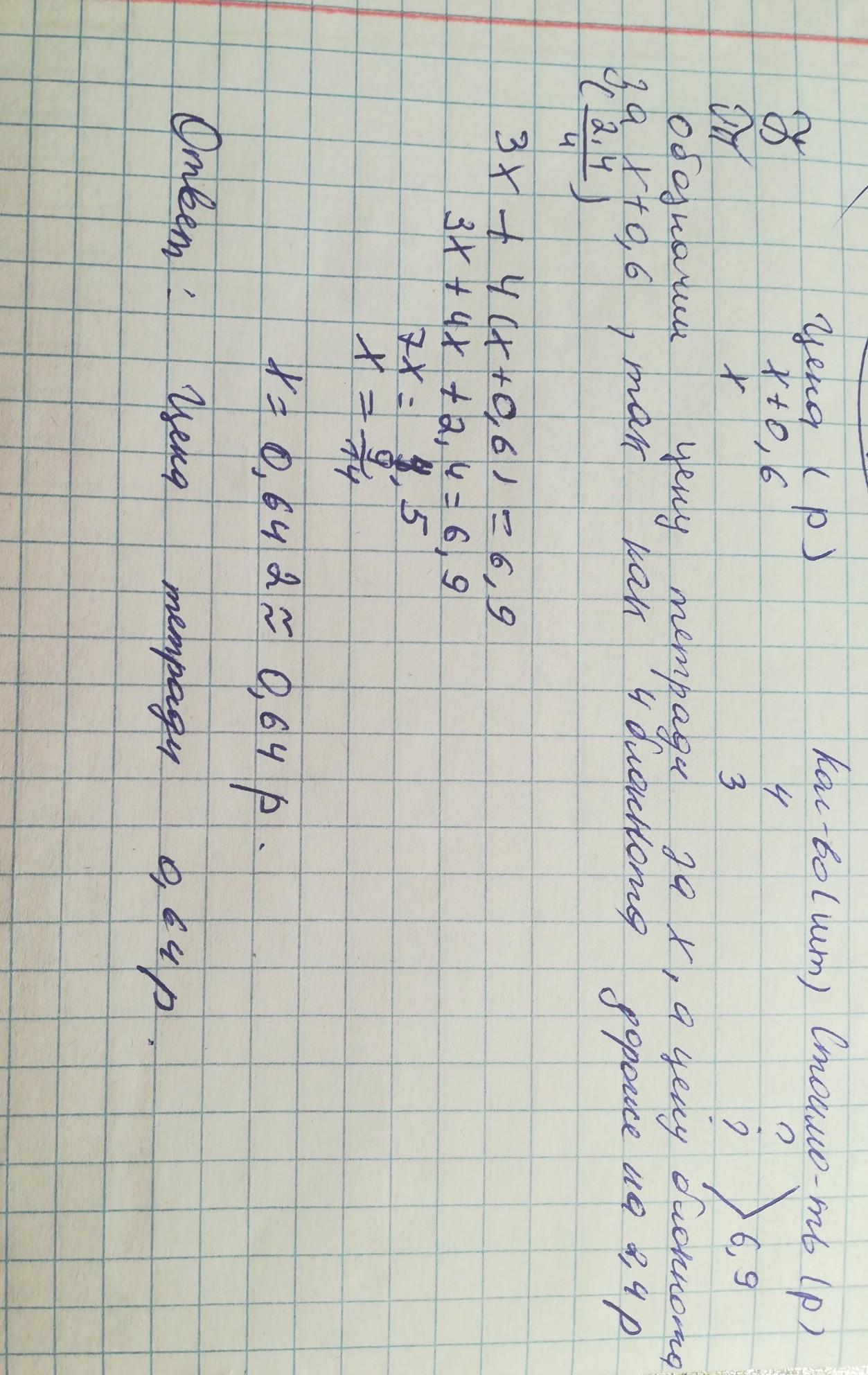 За 5 блокнотов и 4 тетрадей заплатили 6,9 рублей. Сколько стоит одна тетрадь, если 4 блокнота дороже 3 тетрадей на 2,4 рубля. В ответ запишите число без единиц измерения. Срочно!!! Даю 15 баллов!