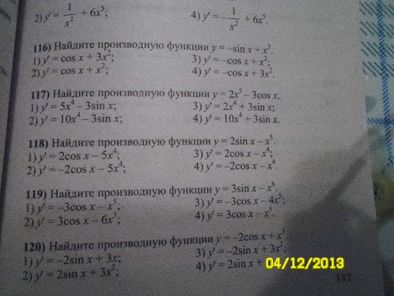 116. y = -sin x + x^3, y' = -cos x + 3x^2. Ответ 4)
