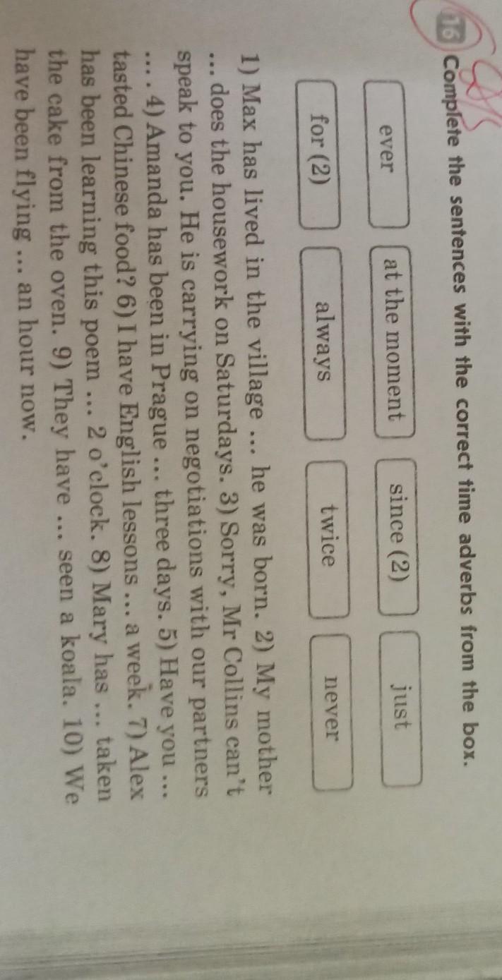 1- since, 2- always, 3- at the moment, 4- for, 5- ever, 6- twice, 7- since, 8- just, 9- never, 10 - for