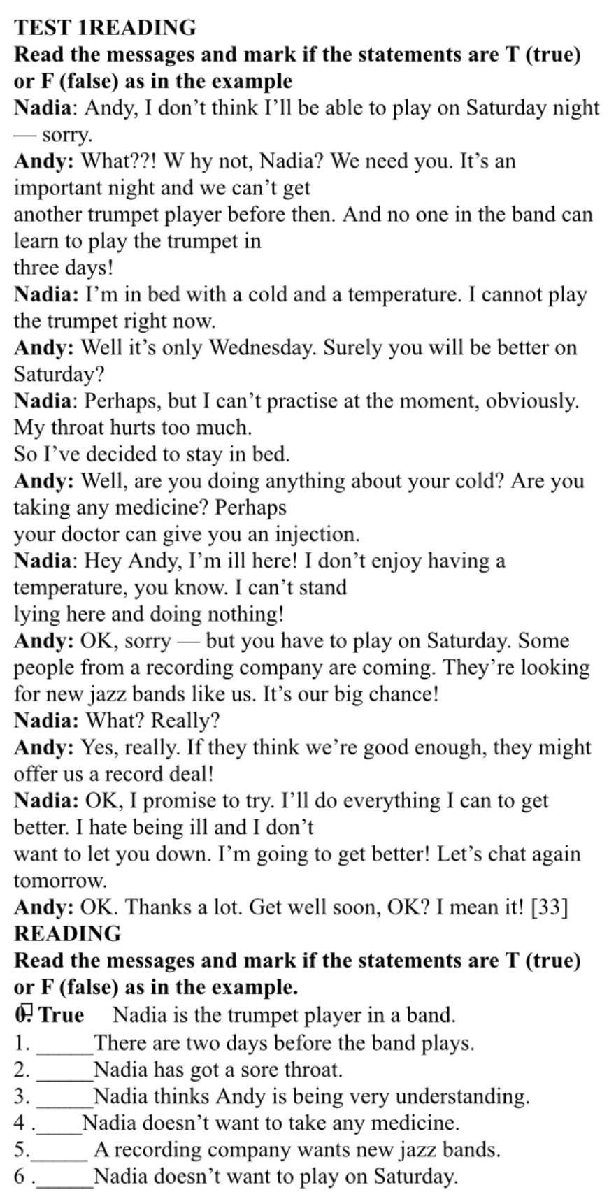 единственный вопрос может возникнуть со вторым вопросом. Там вопрос: "У Нади болит горло. Правда или нет?". Так вот, в тексте говориться, что она простужена и у нее температура, но позже, она говорит, что и горло очень болит.