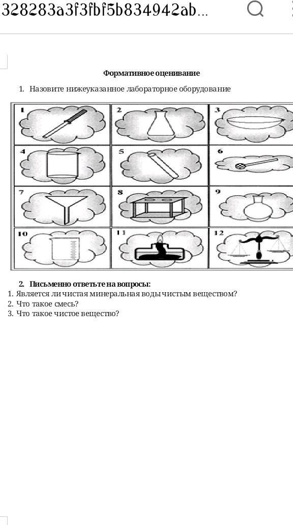 Ответ: 1. Пипетка. 2. Коническая колба. 3. Чашка для выпаривания. 4. Химический стакан. 5. Незнаю. 6. Незнаю. 7. Воронка. 8. Штатив для пробирок. 9. Круглодонная колба. 10. Мерная мензука. 11. Незнаю. 12. Весы