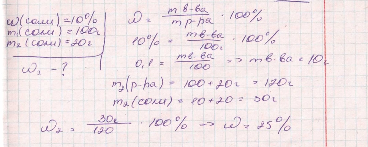 К 100 г 10% раствора соли добавили 20 г этой же соли. Чему равна массовая доля соли в полученном растворе?