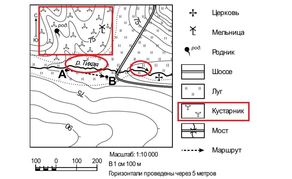 Как видно из карты, которая дана ниже в приложении, река Тихая течёт с запада на восток, направление реки показано стрелкой.Значит заросли кустарника будут на левом берегу.Заросли кустарника можно легко увидеть по условным знакам.
