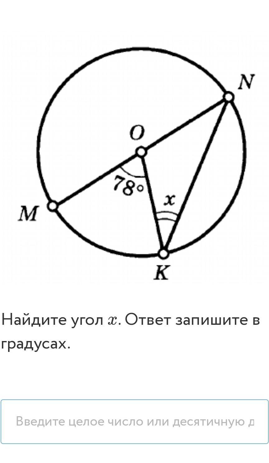 x = ∠OKN = (180° - 102°) ÷ 2 = 78° ÷ 2 = 39°.